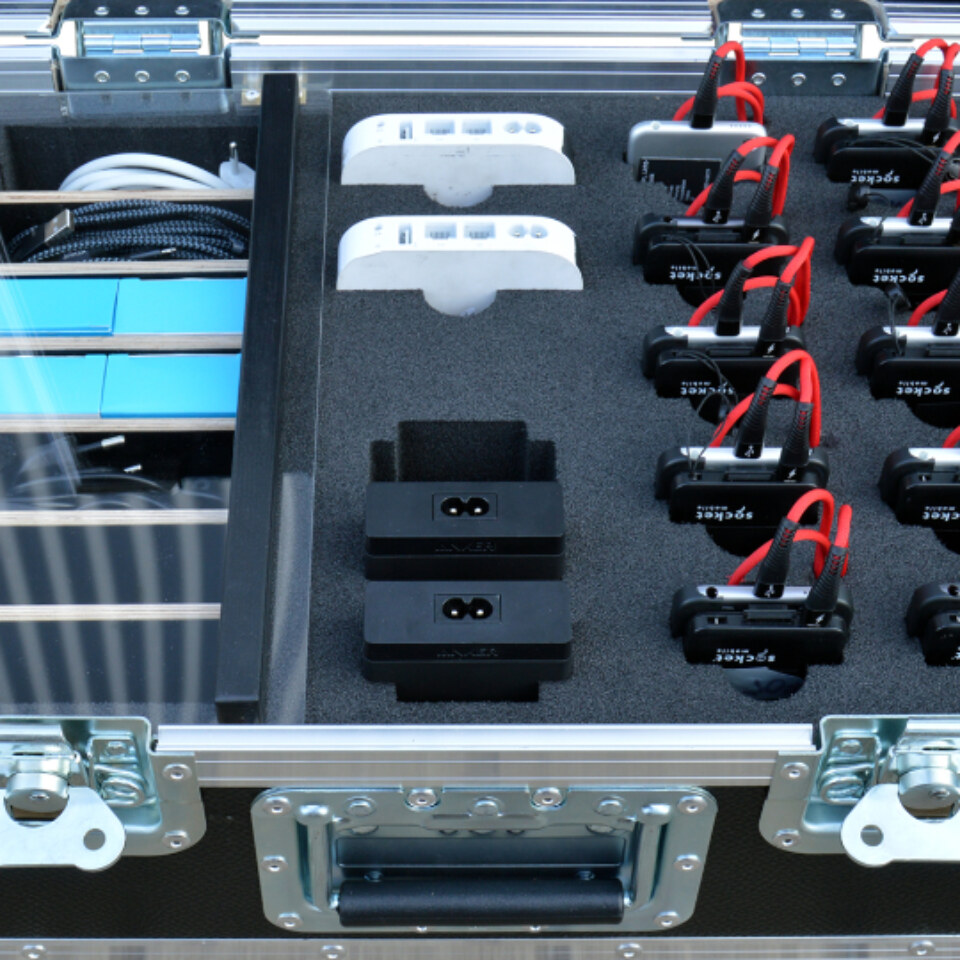 Ladecase für bis zu 120 iPods / Smartphones oder bis zu 60 Tablets. Fächer sind höhenverstellbar. Das case ist aktiv belüftet: Somit können die Geräte auch bei geschlossenem Case geladen werden ohne zu überhitzen. 2 Schubladen für Kabel und sonstiges Zubehör, 2 große Fächer als Stauraum auf der Rückseite